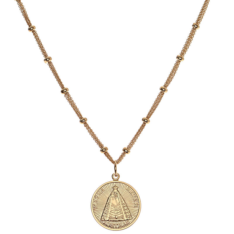 Designkette bestehend aus 4 feinen Ketten mit Kugelelementen und einer wunderschönen Wallfahrtsmünze aus Mariazell als Anhänger mit dem Abbild von Maria mit Kind und der Aufschrift „Magna Mater Austriae“.