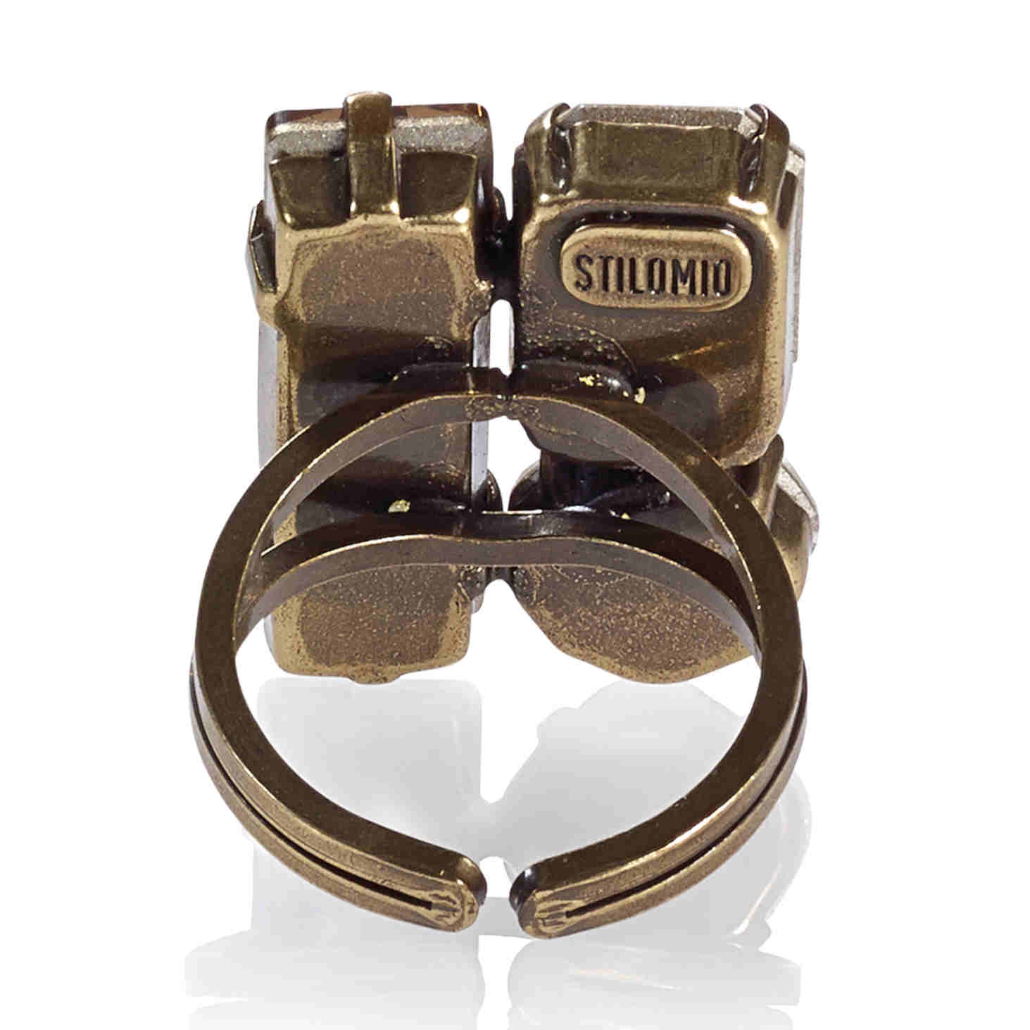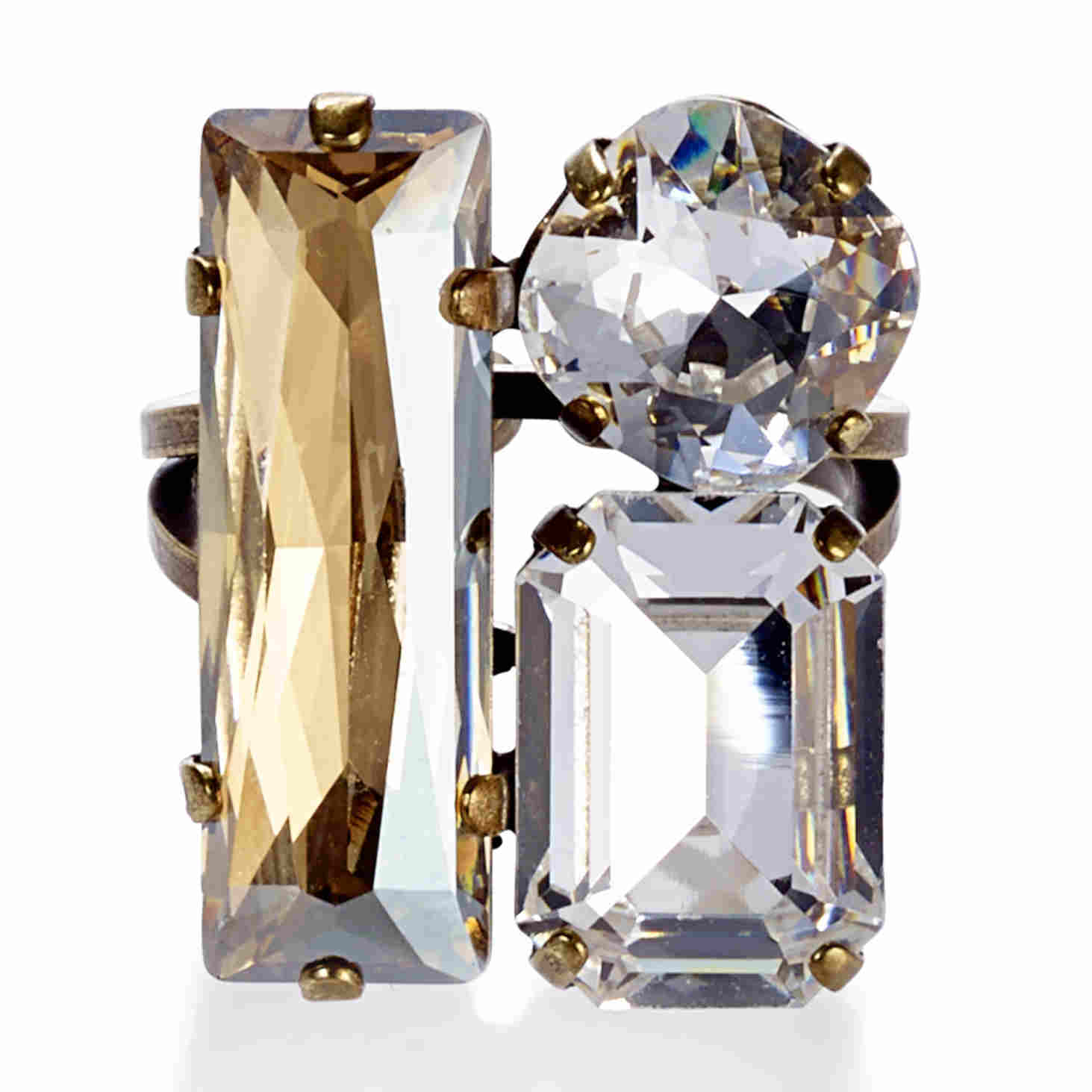 Ring mit einem rundem und zwei rechteckigen Kristallen von Swarovski® in kristall-gold Mix. Oberflächenfarbe 23k vergoldet in antikoptik.